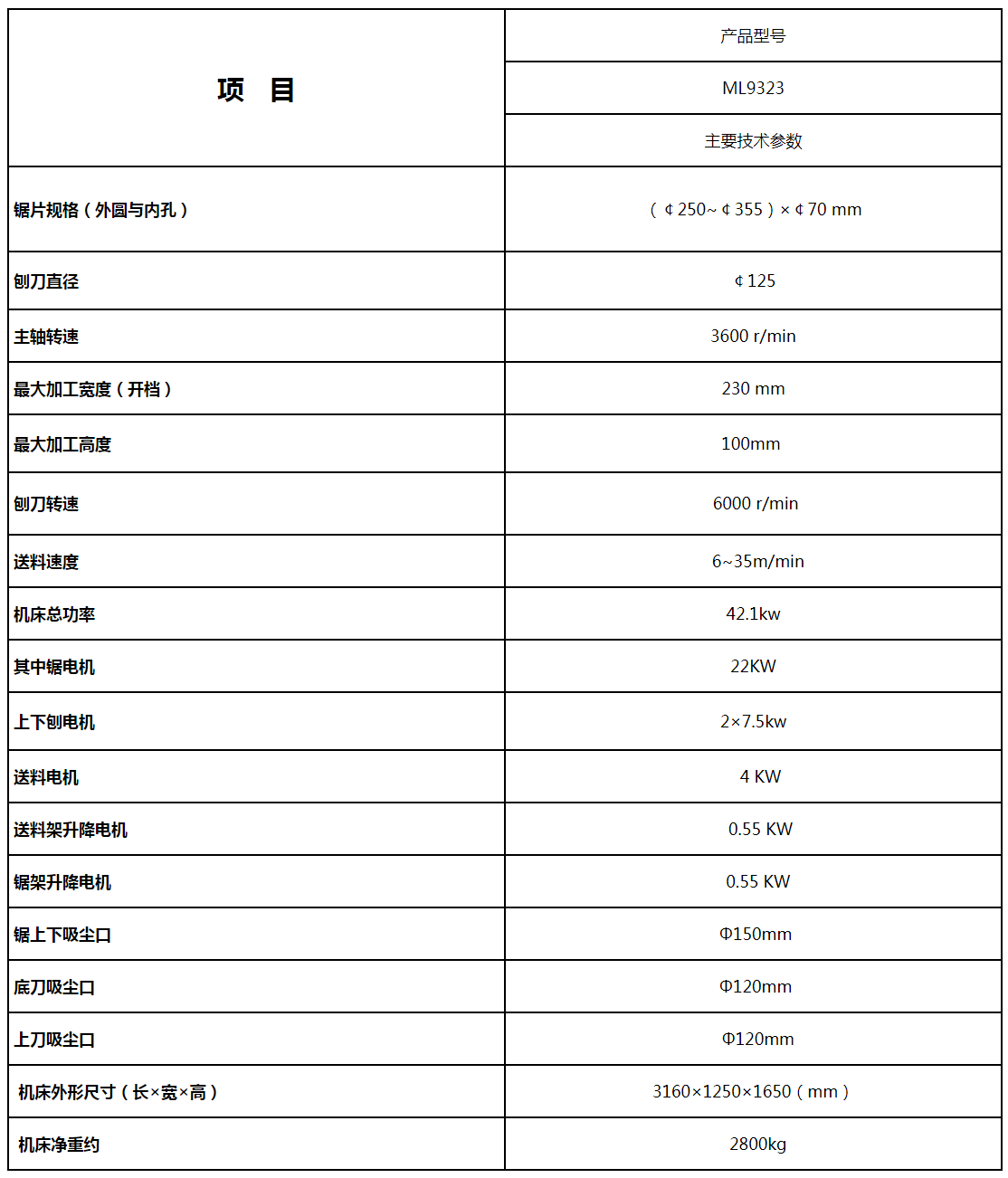1. 本機械將多片鋸與雙面刨合二為一,根據預調尺寸一次進給就能鋸解出多根木條同時進行雙面刨光, 降低了木料損耗率,提高了效率。